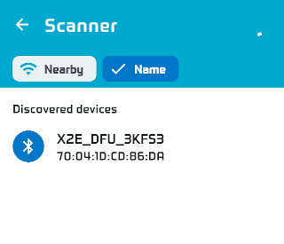 - Open the DFU App, select the firmware binary file, and start scanning for BLE devices.