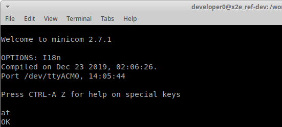 minicom -b 115200 -8 -D /dev/ttyACM0 -o - Send "AT" command to verify connection. You should receive "OK".